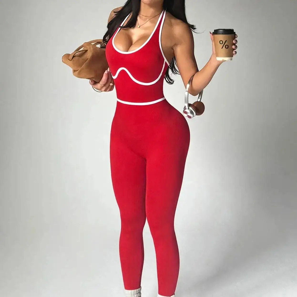 A striking red jumpsuit paired with sharp white rolled edges, tailored to fit curves, creating a dynamic visual focal point.